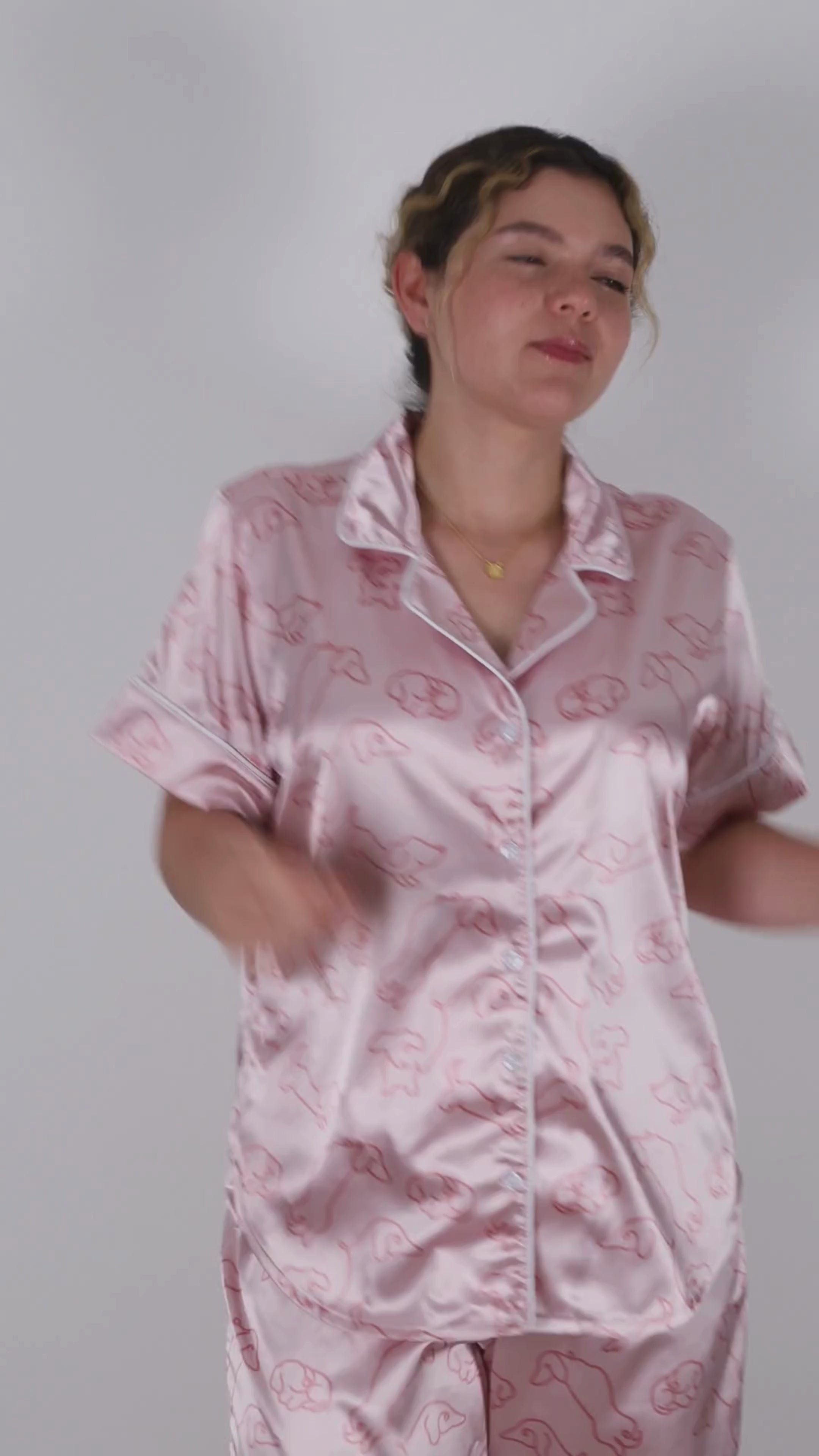 Confeccionada en satín suave al tacto, esta pijama de dos piezas destaca por su divertido estampado de perritos salchicha en líneas rosadas y un embone blanco que le da un acabado delicado pero con mucha personalidad.